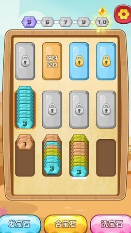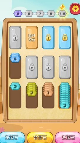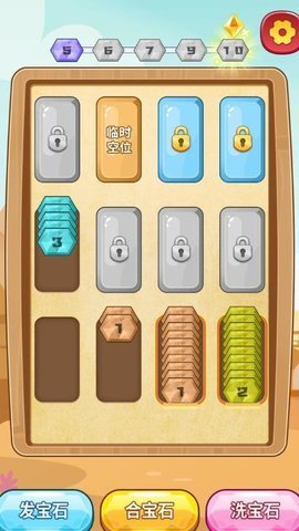 在玩家需要根据宝石的颜色将它们分类,并在特定条件下合成更高级的宝石,获得额外的分数和奖励。当一个解压管内被同一种颜色的宝石装满时,玩家可以点击下方【合宝石】,将该解压管内的宝石进行合成。这种分类合成的玩法让游戏增添了更多的趣味性和挑战性,让玩家不断尝试新的策略和方法。