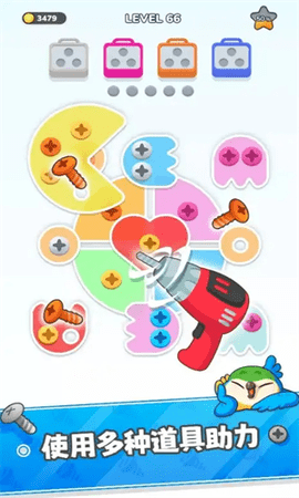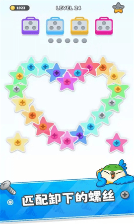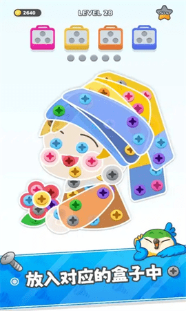 这款游戏是一款趣味探索类游戏,玩家需要按照一定的顺序拧下螺丝并放置到对应颜色的盒子中。当所有螺丝都被放置完毕时,就能完成闯关。游戏玩法简单易上手,还提供了丰富的道具,帮助玩家更轻松地完成挑战。