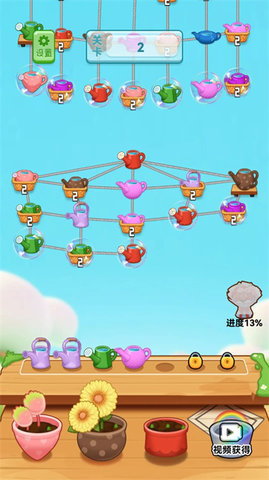 在玩家需要按照操作步骤将相连的水壶点击移动到花盆里面来进行消除,下一个水壶就会出现泡泡,横向联结的绳子消失,水壶也可以被点击了。这种经典的三消玩法让玩家可以体验消除水壶的乐趣,挑战自己的操作速度和反应能力。