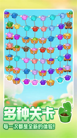 除了消除水壶,玩家还可以点击花盆,相同颜色的水壶会摇摆,帮助玩家更好地找到对应颜色的水壶。完成挑战还可以获得不同的花束,为游戏增添了一些收集元素。玩家还可以解锁新的闯关内容以及丰富的奖励,增加了游戏的可玩性和挑战性。