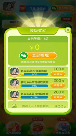1、轻松完成闯关任务,赚取金币,顺利通关可以获得更高奖励,还有机会获得专属红包哦。