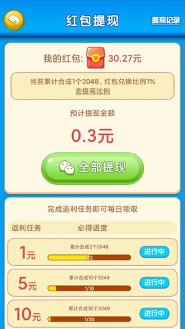 梦想2048红包版是一款备受欢迎的游戏,它不仅可以让玩家轻松合成2048,还可以通过赚取红包来实现提现。虽然每个玩家只有一次3元提现机会,但是玩家可以通过钻石兑换来获取更多的红包,从而提升兑换比例,赚取更多的红包。