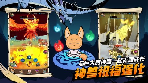 1、通过关卡战斗和放置奖励,玩家可以强化神兽的祝福。
