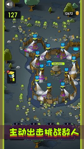 4、从一开始就建造防御塔,不断升级和部署防御阵容,添加更多的防御工事,抵御一波又一波的僵尸攻击,完成自己的塔防建设。