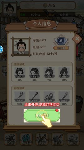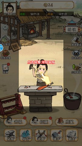 2、为了提高效率,玩家可以通过疯狂点击铁匠赚取更多的铜板,用于升级提高效率和加盖房屋。