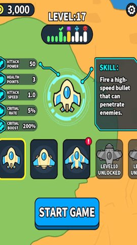 2、通过增强和升级战斗机,你可以解锁更多的武器和装备,提升生命值、速度和火力。
