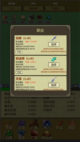 3、在挂机修个仙无限砍怪抽卡升级的闯关过程中,角色可以自动挂机进行战斗挑战,完成任务领取奖励,观看广告还能获得钻石和随机的专属功法。