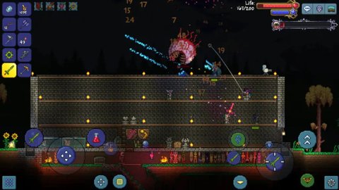 2、通过战斗,玩家可以获得掉落物,利用加工建筑制作武器和装备武装自己,确保能在危机四伏的泰拉瑞亚大陆活下去。