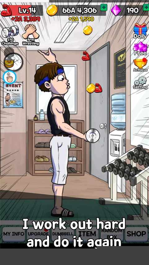 角色培养与资源管理:玩家拥有一个训练馆界面,可以在此使用金币升级点击力量(每次点击获得更多能量)或耐力(减缓力竭速度)等基础属性。可以解锁并升级自动训练师,使其在玩家离线时也能持续产生金币和经验。如何平衡即时战力提升与长期资源生产效率,是资源管理的重点。