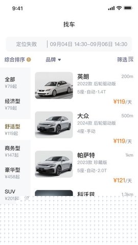 核心租车流程:在主界面输入或授权获取您的取车地点与用车时间,随后在车型列表中进行浏览筛选,点击心仪车辆可进入详情页查阅全部信息。