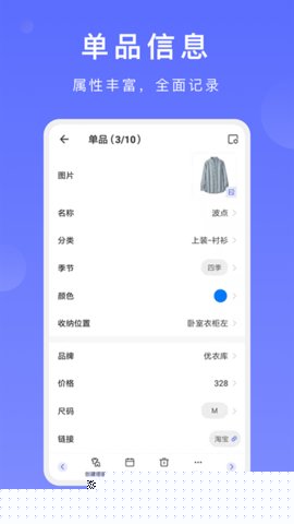 1. 构建闭环式衣物生命周期管理:从新衣录入、日常搭配、季节收纳到最终闲置处理,尽简衣橱提供了一套完整的数字化管理链路。用户不仅可以记录购买信息,还可以为衣物添加穿着次数、维护记录,乃至规划流转或捐赠,让每一件服饰从购入到退出的全过程都清晰可溯,管理极具系统性。