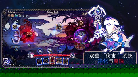 净化与腐化的动态平衡系统:游戏的核心战斗围绕净化值与腐化值的消长展开。玩家与敌人各自拥有这两条状态条。使用蓝色净化骰面攻击可以减少敌人的净化值(等同于造成伤害),而使用红色腐化骰面则需承担自身腐化值增加的风险。更精妙的是,腐化并非完全有害,当自身腐化值积累到特定美德阈值时,会触发强力的专属技能,鼓励玩家在刀锋上行走,巧妙利用腐化力量来扭转战局。