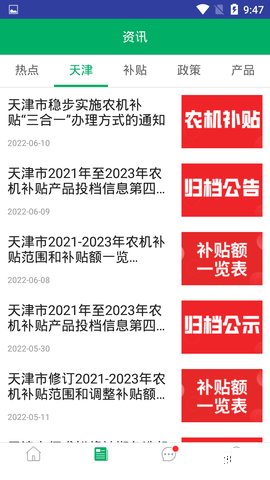 政策资讯精准推送:软件首页设有政策动态专栏,不仅集中发布国家及天津市最新的农机购置补贴相关政策文件、通知公告,还能根据用户的属地信息,智能推送与其相关的区级实施方案、补贴额一览表等,确保农户获取的信息是最新、最准、最相关的。