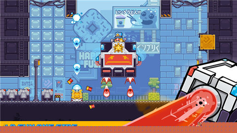 基于物理的后坐力移动系统:射击不仅是消灭敌人的手段,更是驱动战车移动的核心动力来源。这一物理系统的引入,打破了平台游戏传统的移动模式。玩家需要计算射击角度与后坐力方向,利用向地面射击实现垂直起跳(火箭跳),利用向侧面射击调整空中轨迹或对抗惯性。特别是在倾斜、滑动的平台场景中,结合环境重力与自身动量,通过微调射击来达成精准落点,成为了游戏高阶玩法的精髓,充满了探索与操作的乐趣。