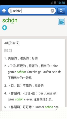 动词变位全解析功能:针对德语动词变位复杂的难点,该功能提供了强大的查询与学习支持。用户输入任意动词原形,即可获得该动词在所有时态、语态及所有人称下的完整变位表,并伴有典型用法例句和常见搭配提示,是攻克语法难关的利器。