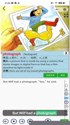 沉浸式图文音同步阅读:在播放音频时,屏幕上的英文文本会随之逐句高亮显示,并伴有精美的绘本原图。这种听觉、视觉的强关联同步,极大地辅助了孩子将声音与文字、图像进行对应,有效加深了对词汇和句子结构的记忆与理解。