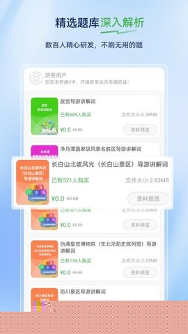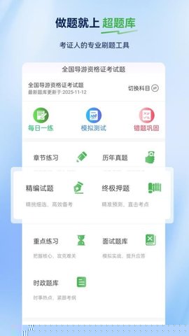 导游证超题库是一款专为导游资格考试设计的综合性备考软件深度整合了政策与法律法规、导游业务、全国导游基础知识及地方导游基础知识四大核心考试科目的海量学习资源,内的所有题目均严格依据文化和旅游部发布的最新考试大纲进行编写与更新,确保了内容与真实考试的命题方向、重点及难度高度一致,不仅提供了覆盖全部考点的真题与模拟题,更通过智能算法分析用户的学习行为,动态生成个性化的复习路径,帮助考生高效识别并攻克知识薄弱环节。其详尽的题目解析超越了简单的答案对错,深入阐释了选项背后的理论依据、法规条文内涵以及在实际导游工作中可能的应用场景与常见误区,帮助用户构建系统、扎实的专业知识体系,从而在笔试与面试中都能从容应对,显著提升考试通过率。