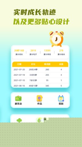 2. 数据驱动的成长洞察:软件将孩子的所有学习行为,包括阅读时长、书目完成率、词汇接触频率、发音进步轨迹等,全部转化为可视化的数据报告和成长档案。这些客观的数据让学习效果变得清晰可见,帮助家长超越主观感受,从认知发展、习惯养成等多个维度,更科学地了解孩子的学习状况和阶段性成果。