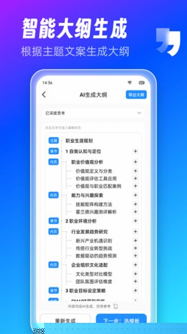 大纲审阅与编辑:系统会首先生成一份详细的文稿大纲页面。在此阶段,请务必仔细预览各个章节的标题与要点内容。您可以对章节顺序进行拖拽调整,对不满意的标题或要点进行文字修改,甚至删除或添加新的小节。这是确保最终文稿内容符合您思路的关键一步,确认无误后,点击下一步。