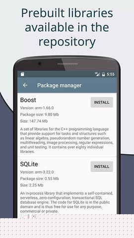 2. 扩展的包管理功能:软件内置了一个高效的包管理器,允许用户从自定义的仓库中直接下载和安装预编译的第三方库,Boost、SQLite、CURL等。这个特性极大地扩展了开发范围,用户无需手动交叉编译,就能轻松为项目添加强大的库支持,简化了开发环境配置。