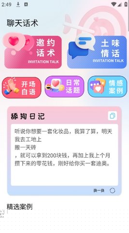 1. 情境驱动的智能话术匹配:软件并非简单罗列句子,而是建立了一个基于恋爱阶段和具体场景的智能匹配系统。用户可以根据初次约会、对方生气、表达思念等具体情境进行筛选,系统会推送最贴合该情境的系列话术,实现了从泛泛而谈到精准应对的跨越。