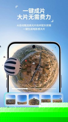素材管理与快速编辑:飞行结束后,在软件的相册模块中可以浏览所有拍摄的素材。选择需要的视频或照片,点击创作按钮,即可进入编辑界面。这里可以剪辑片段、添加滤镜、选择音乐,并利用AI成片功能自动生成短片,直接分享至社交平台。