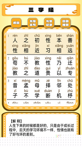 2. 沉浸式古典文化语境:区别于单纯的写字练习,巧妙地将汉字学习嵌入三字经、千字文等经典蒙学篇章的语境中。用户在临摹字的能聆听诵读、理解文意,实现识字、写字与文化熏陶的同步进行,提升了学习的深度与趣味。