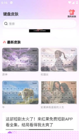 浏览与试用皮肤库:返回应用主界面,您将看到主题商店、我的收藏等板块。在主题商店中,可以通过顶部分类(如热门、新品、二次元)或搜索框查找皮肤。点击任意皮肤缩略图进入详情页,再点击预览试用按钮,即可全屏模拟真实输入场景,感受按键触感、音效和动画效果。