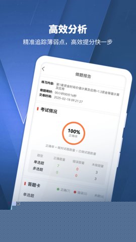 智能组卷与能力评估:用户可根据自身需求,按章节、知识点、难度或历年真题等维度,自由组合生成练习试卷。每次练习或模考后,系统会提供详尽的数据分析报告,包括各板块得分率、答题时间分布、与全体用户的对比等,量化学习成果。