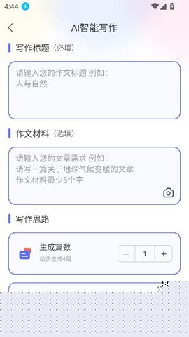 智能提纲生成:用户输入作文题目和要求后,可迅速生成多个逻辑清晰、角度各异的写作提纲,包括中心论点、分论点及论据提示,为用户搭建稳固的写作骨架。