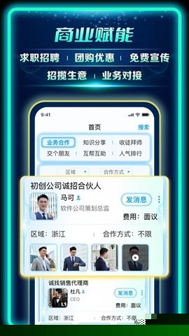 商业赋能中心:为企业用户提供发布招聘信息、推广商业项目、寻找合作伙伴的专属空间,并配备简单的CRM工具,方便管理潜在客户与商机。