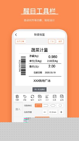 可视化拖拽编辑与所见即所得:编辑界面采用直观的可视化操作,标签上的每一个文本块、条码、图片或图形元素都可以通过手指直接拖拽来调整位置。所有属性修改都能实时在屏幕上呈现,真正实现了所见即所得的设计体验,让非专业用户也能轻松上手。