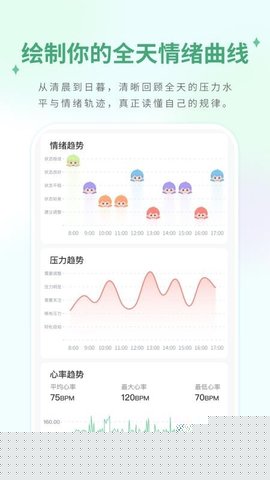 实时身心仪表盘:主界面集成了核心指标的实时可视化组件,如动态跳动的心脏动画对应实时心率,环绕其周围的色彩光环则反映当前情绪基调,让用户一瞥之间即可掌握关键状态。