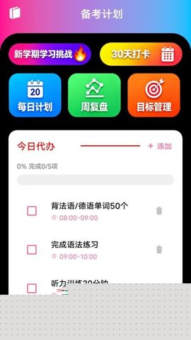 智能复习计划与打卡:系统根据用户的记忆曲线和学习历史,自动生成每日的学习与复习任务,并通过打卡和进度追踪功能,帮助用户养成持之以恒的学习习惯。