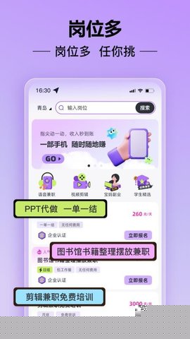 多元兼职是一款连接个人灵活就业需求与市场短期人才缺口的高效数字化平台通过整合遍布全国的海量、经过验证的兼职岗位信息,为用户提供了一个安全、便捷且高回报的求职环境。的核心价值在于打破传统求职的信息壁垒,运用智能算法进行人岗精准匹配,不仅涵盖了常见的促销、客服、配送等基础岗位,更深度挖掘如线上翻译、内容创作、活动策划、技能教学等专业化领域的机会。无论是希望利用课余时间赚取生活费的学生,寻求工作与生活平衡的职场人士,还是希望发挥余热或灵活安排时间的宝妈及自由职业者,都能在这里找到适合自身技能与时间安排的优质工作。平台严格审核雇主资质与岗位真实性,并推行透明的薪酬体系与日结/周结等灵活结算方式,切实保障求职者的劳动权益与即时收益,让每一份技能和时间的付出都能获得应有的价值回报。