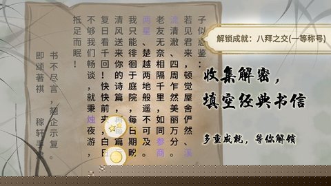 将发现的笔画碎片在虚拟界面进行拖拽组合,尝试形成完整的汉字,成功识别出的字通常指向一个具体的季节或时辰,这是激活当前书信场景的关键。正确组合汉字后,对应的画卷区域会泛起微光,一封信函的虚影将缓缓浮现。