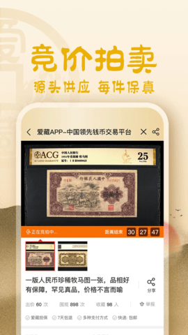 爱藏网是一款专注于收藏品领域的综合性线上服务平台,它最初以钱币交易为核心业务,现已成功拓展至邮票、纪念钞、古玩杂项等多个收藏品类。软件构建了一个集拍卖、固定价集市、实时直播售卖于一体的多元化交易生态系统,并整合了专业的评级鉴定服务。平台连接了数百万收藏爱好者与行业从业者,不仅促进了各类藏品的流通与价值发现,还形成了一个围绕藏品鉴赏、市场分析和文化交流的活跃社区,为用户提供了从信息获取、藏品鉴定到安全交易的全方位解决方案,成为收藏爱好者值得信赖的数字化助手。