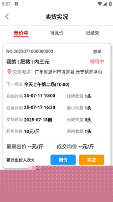 实时在线拍卖大厅:提供公开透明的竞拍环境,买家可以对心仪的生猪批次出价竞拍,系统支持设置代理出价,并在竞拍结束时自动生成成交订单,过程紧张刺激且公平。