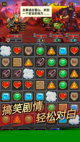 战斗与消除的深度绑定机制:游戏最大的创新在于彻底打破了消除玩法与战斗系统之间的壁垒,棋盘上的火、水、自然等元素直接对应不同的攻击类型,连接消除三个红色火元素,骑士就会向前劈出一道火焰斩击;消除四个以上的蓝色水元素,则可能触发范围冰冻效果,这种设计使得策略层面直接下探到棋盘操作,每一步消除都需考量对战场造成的即时影响。