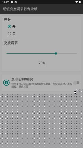 核心亮度滑块调节:软件主界面提供一个高度敏感且平滑的横向滑动条,用户通过手指左右滑动即可实现从100%系统亮度到接近0%视觉亮度的无级连续调节,实时反馈效果,操控直观且精准。