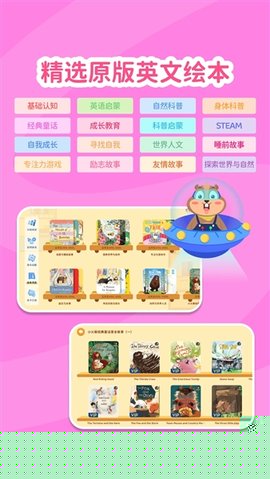 日常学习时,可以直接从今日推荐板块开始,这里的内容是系统为您孩子量身定制的。打开一本推荐绘本,您可以选择自动播放模式让系统朗读并自动翻页,也可以选择亲子共读模式,由您来控制翻页节奏并亲自为孩子朗读。阅读过程中,点击画面中的物体常有惊喜音效或单词发音,可以鼓励孩子多点探索。