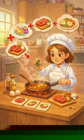 创新的合成进化体系:游戏摒弃了传统的线性升级模式,采用了富有策略深度的合并机制。将两个相同的低级物品(无论是食材、厨具还是装饰)放置在一起们便会融合进化成更高级的形态。这种设计让每一次点击都充满期待,玩家需要思考合成路径,规划资源分配,以最高效的方式解锁顶级菜肴和华丽的餐厅设施。