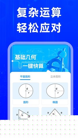 几何参数计算:将几何计算功能模块化,用户可选择常见的平面图形(如圆形、三角形、矩形)或立体图形(如球体、立方体、圆柱体),输入已知参数(如半径、边长、高),即可自动计算出面积、周长、体积、表面积等全部相关几何量,并附带简要的公式说明以供参考学习。
