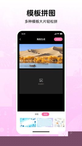 多样化海报模板一键应用:软件集成了丰富的海报风格模板,用户完成基础拼接后,可一键套用模板,快速为长图添加艺术字体、背景和装饰元素,使其瞬间变为精美的宣传海报。
