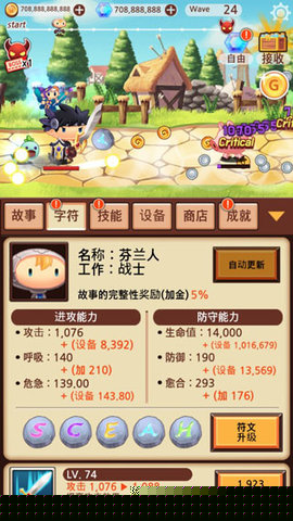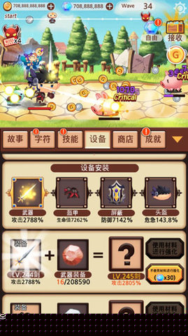 核心玩法围绕关卡推进与角色养成展开。玩家初期通过点击选择关卡即可开启冒险,战斗过程高度自动化。首要目标是推进主线,尽快解锁自动战斗功能,这是高效积累金币、装备和符文等基础资源的核心途径。