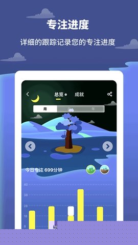 详尽的数据统计与成就页面:功能强大的统计模块以图表形式展示每日、每周、每月的专注总时长、专注次数分布等。达成特定的连续专注天数或总时长里程碑后,用户可以获得特殊的树木品种或森林装饰物作为成就奖励。