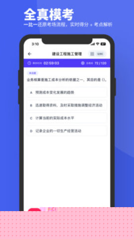 当完成一定量的章节练习后,可以启用智能组卷功能进行阶段性测试。系统会根据你的历史表现和考试重点,自动生成一份难度适中的模拟试卷。进入模拟考试后,请严格按照倒计时答题,以训练答题速度和时间分配能力。交卷后,系统会提供详细的得分报告和题目分析。