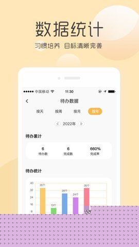 4. 趋势洞察图表:软件内嵌简洁明了的数据统计模块,能够将用户一段时期内的任务完成情况以折线图或柱状图形式可视化,帮助用户宏观把握自己的效率周期与模式。