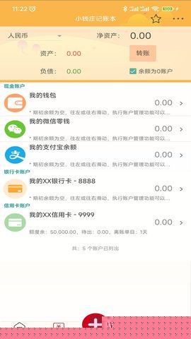 全功能资产与负债管理:用户可以在此模块中集中管理所有资产账户(如现金、储蓄卡、信用卡、投资账户)和负债项目。每进行一笔关联交易,相应账户的余额便会自动更新,实时反映真实的净资产状况,并支持账户间的转账操作。
