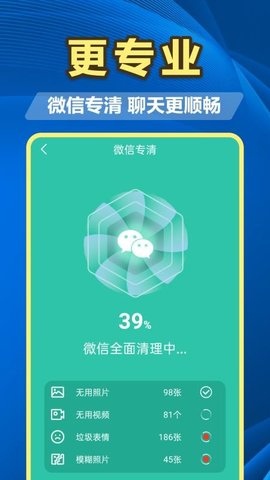 2. 专项社交应用清理:针对微信、QQ等社交软件产生的海量聊天图片、视频和文档缓存,提供了定向深度清理功能,能有效释放被这些隐形大文件占据的宝贵存储空间。